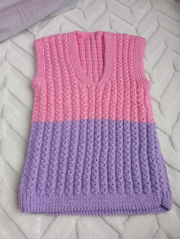 Kız çocuk için triko, v yaka, kolsuz, pembe ve lila pastel tonlarda, dar kesim yelek. Knitted yapısıyla yumuşak ve rahat.