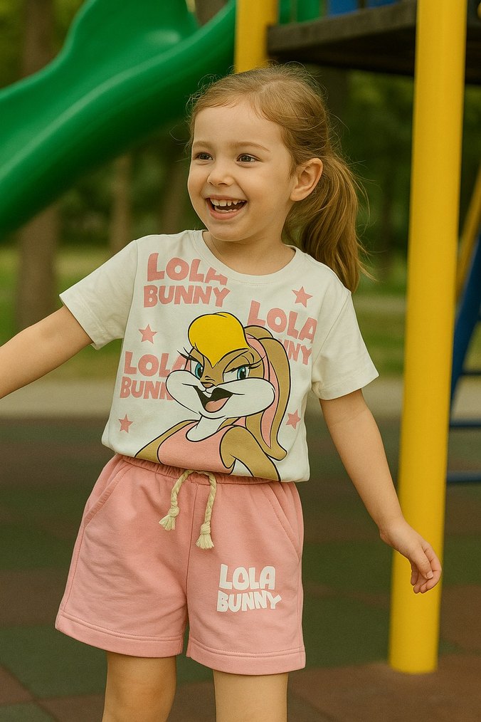 Pamuklu kısa kollu, salaş kesim üstü Lola Bunny baskılı. Pastel pembe şortları dantel detaylı ve bağcıklı bel ile rahatlık sağlar. 2-3-4-5 yaş mevcuttur