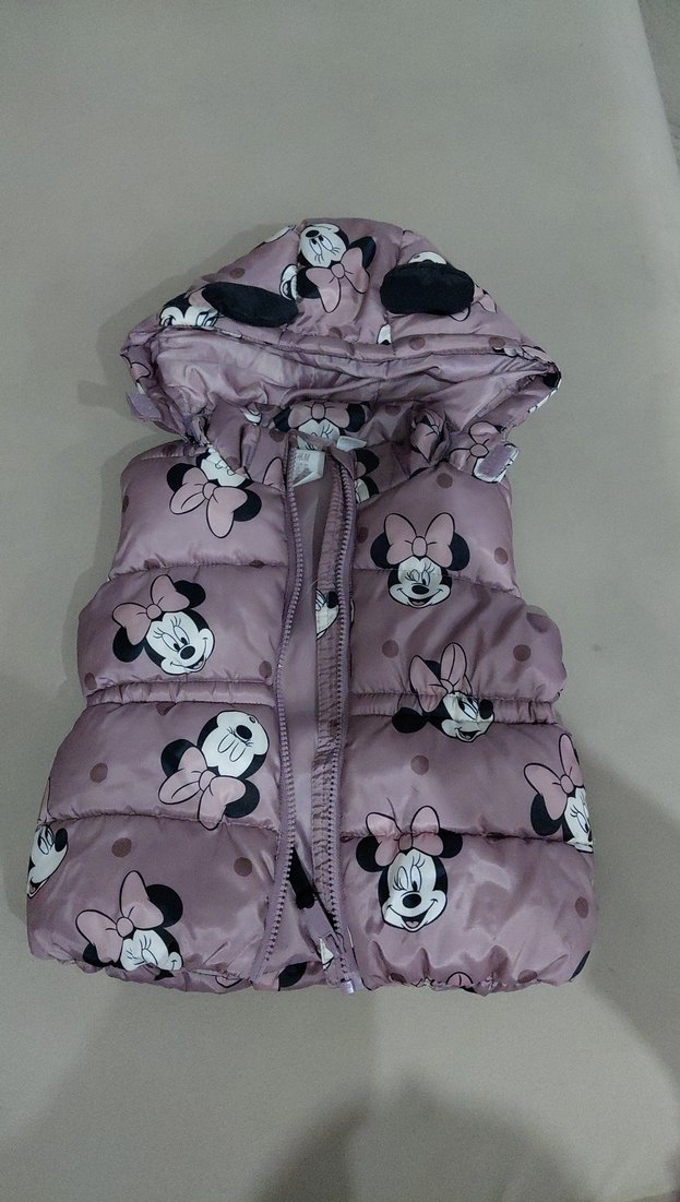 Kapüşonlu, düğmeli ve renkli Minnie Mouse baskılı pembe kız çocuk yeleği. İnce kesim ve yumuşak, sıcak dokusu ile rahat kullanım sağlar.