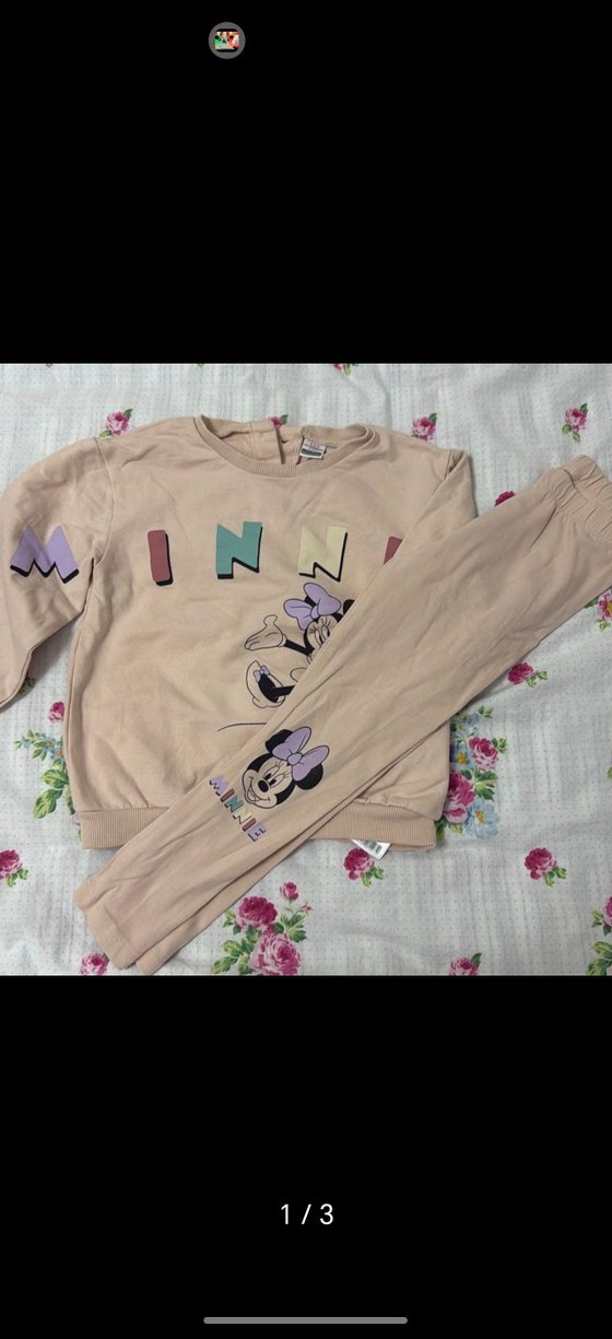 Pamuklu, uzun kollu ve bisiklet yaka kız çocuk eşofman takımı. Pastel pembe renkte, Minnie baskılı ve örme dokulu, trend sokak stili için uygundur.