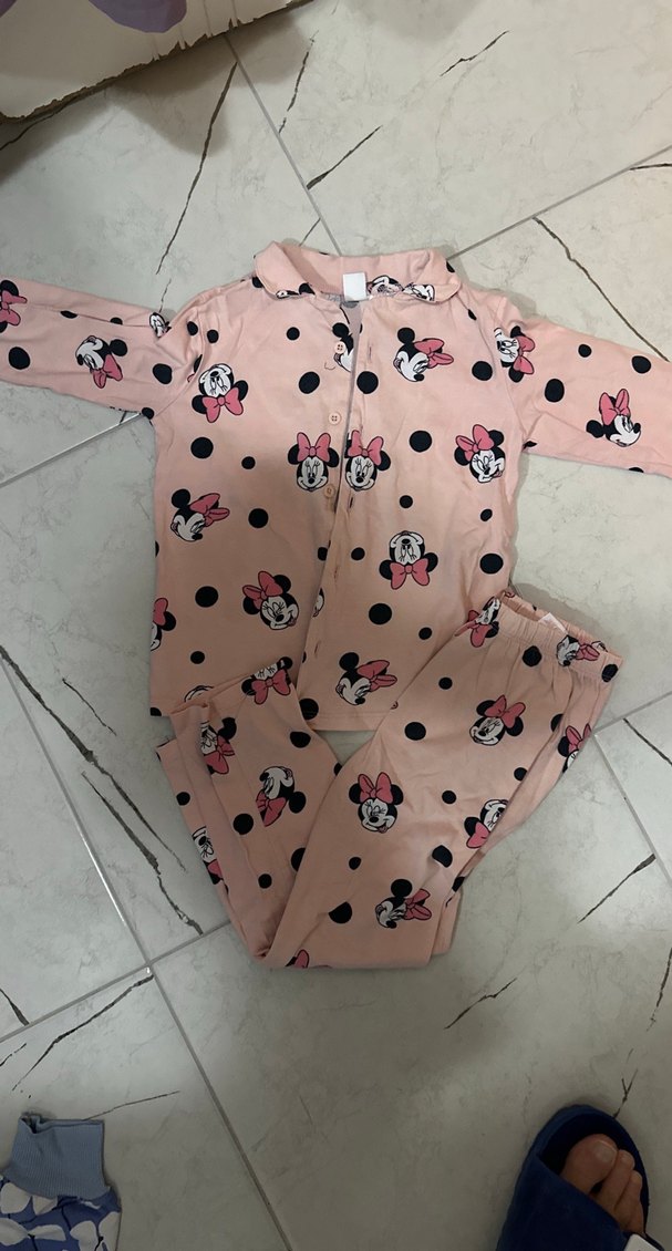 Kız çocuklar için pastel pembe renkte, Minnie Mouse baskılı ve siyah noktalı pijama takımı. Uzun kollu, V yakalı ve düğmeli ön kısmı kolay kullanım sağlar. Yumuşak sentetik kumaştan üretilmiştir. ️