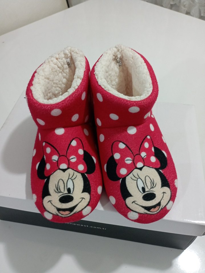 Kız çocukları için renkli Minnie Mouse baskılı, örgü detaylı, yumuşak ve sıcak polar kumaştan yapılmış terlikler. Rahat ve şık ev kullanımı için uygundur.