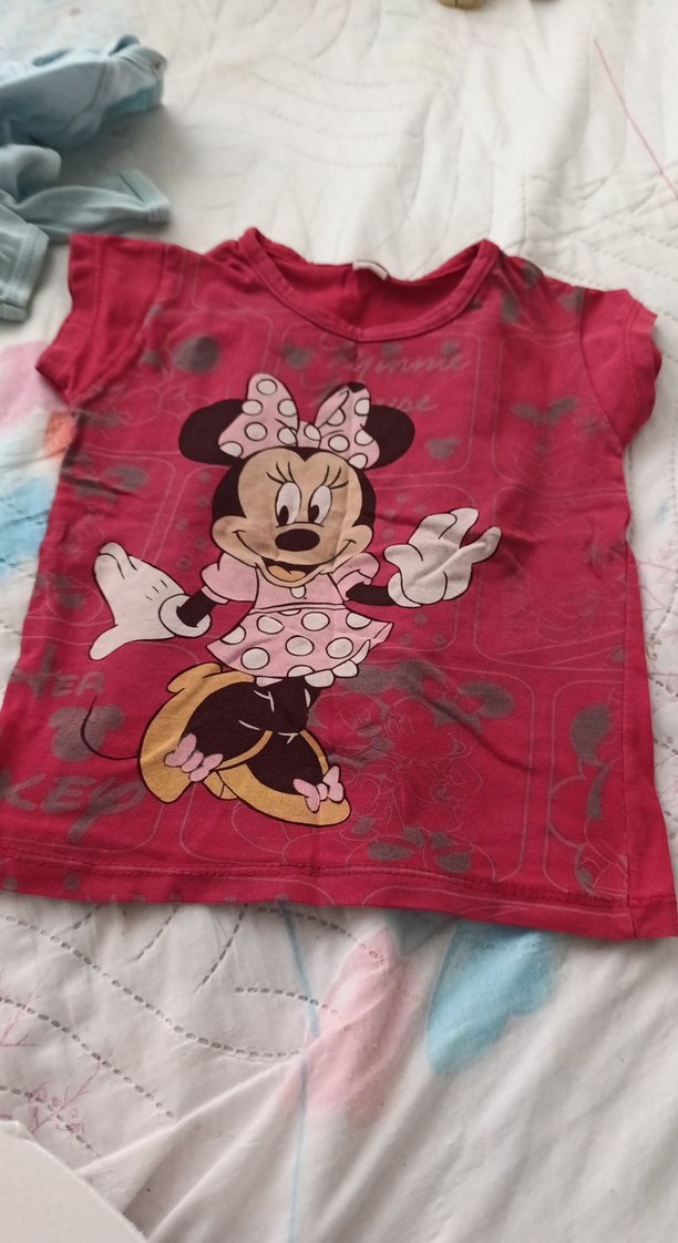 Pembe renkli, dar kesim kız çocuk tişörtü, kısa kollu ve yuvarlak yakalıdır. Renkli Minnie Mouse baskısı vardır.