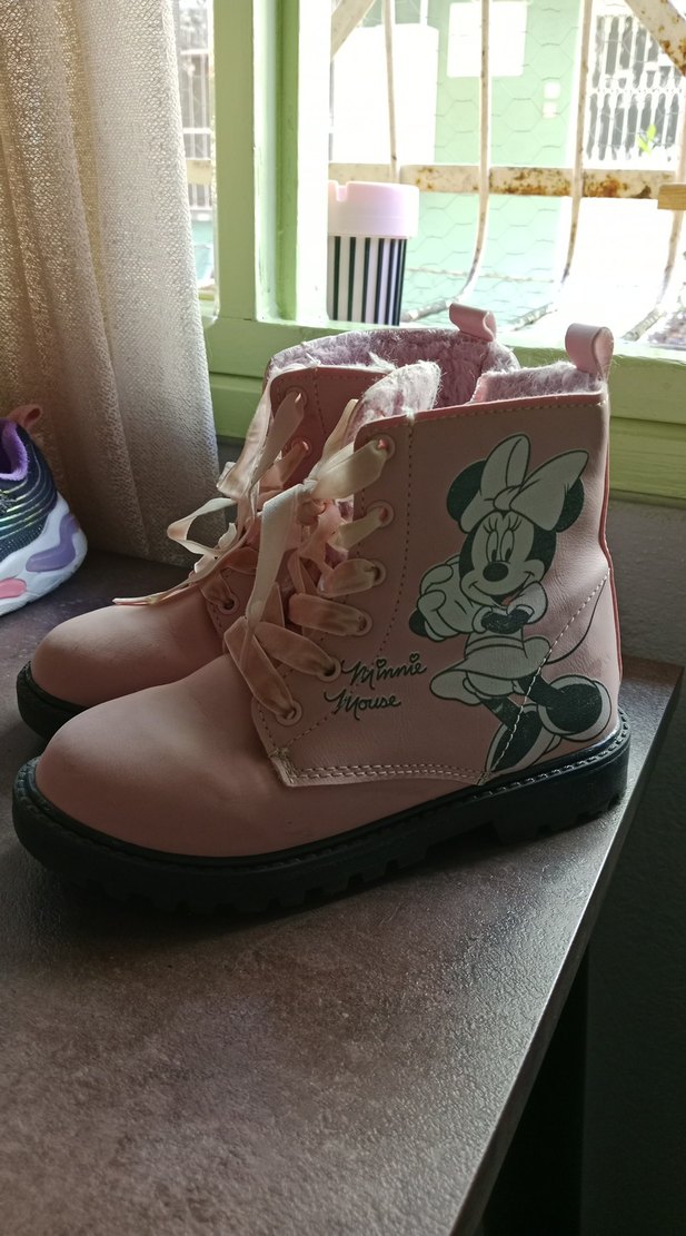 Pembe kauçuk kız çocuk botları, baskılı Minnie Mouse desenli ve cırt cırtlı. Yumuşak iç astar rahatlık sağlar. Sokak stili için uygun.