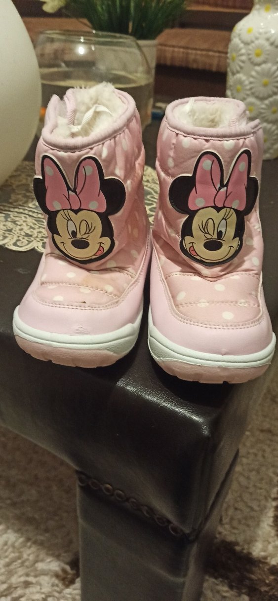 Pembe kauçuk kız çocuk botları, Minnie Mouse baskılı ve cırt cırtlı, renkli ve trend sokak tarzına uygun.