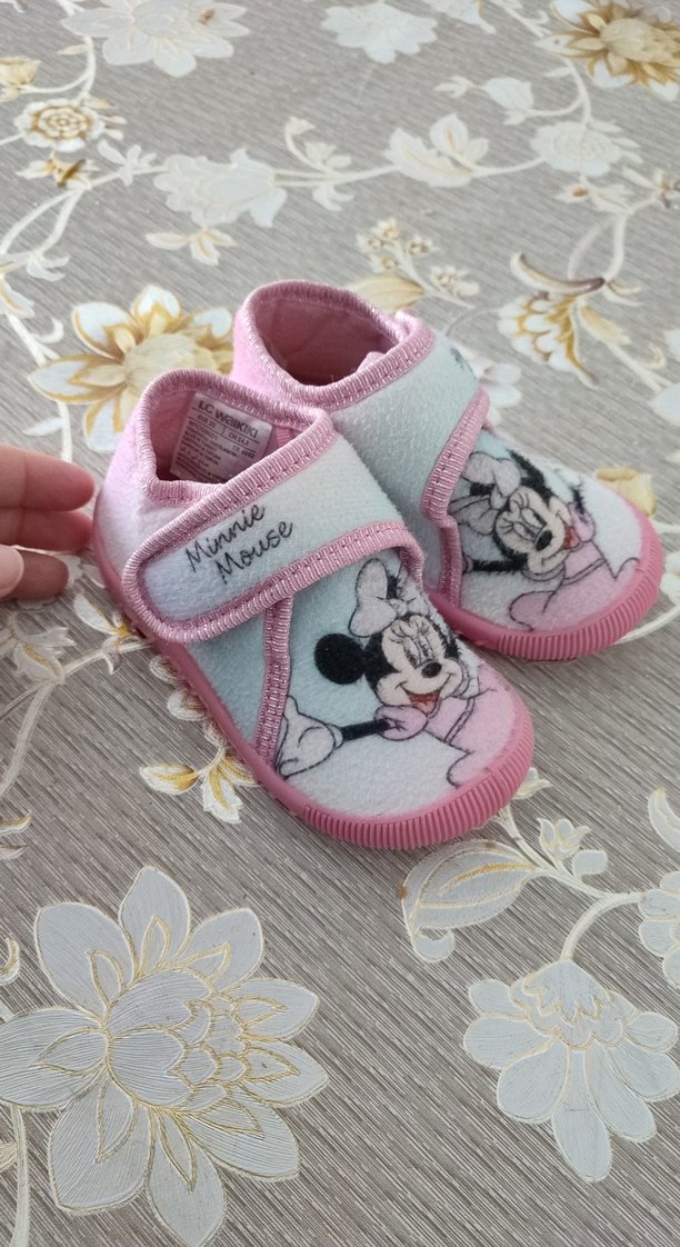 Kız çocukları için pembe renkli, Minnie Mouse baskılı, cırt cırtlı sıcak ve yumuşak ev terliği. Pastel tonlarda rahat bir tasarım.