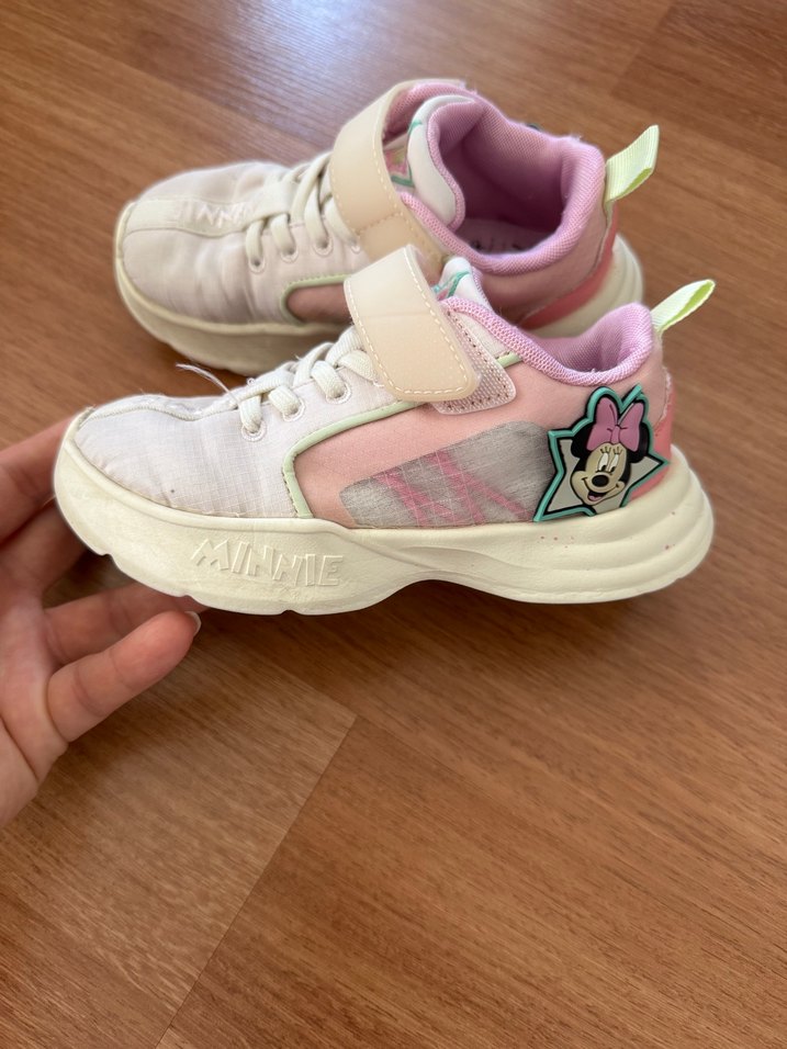 Kız çocuklar için pembe tonlarda, Minnie Mouse baskılı ve kolay kullanımlı cırt cırtlı spor ayakkabı. Kauçuk tabanlı, sokak stiline uygun. Bu sezon alınmıştır