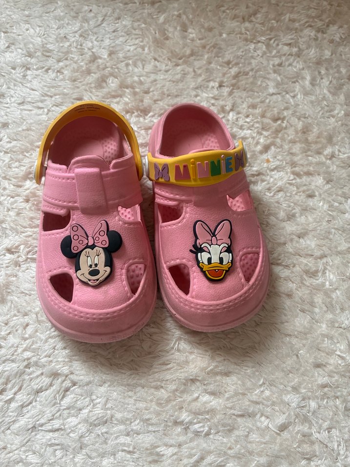 Kız çocuklar için pembe kauçuk terlik, renkli Minnie ve Daisy baskılı, cırt cırtlı kaydırmaz bantlı. Trend sokak stili için uygun.