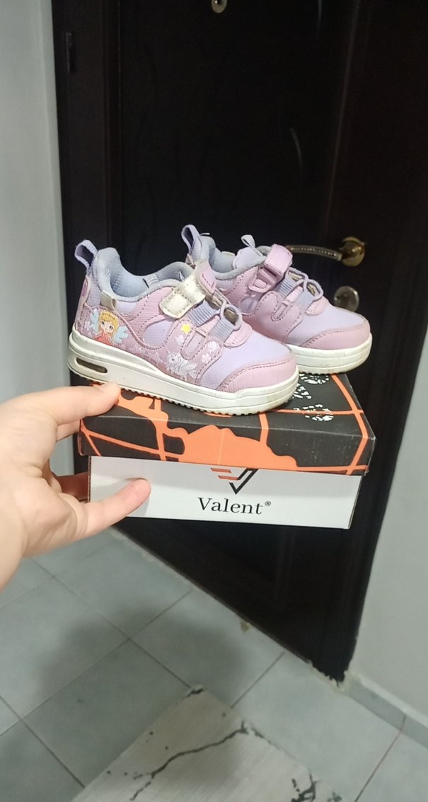 Kız çocukları için pembe mor ışıklı pastel renkli, baskılı ve Velcro bantlı sneaker. Kauçuk tabanlı, street wear tarzında. Marka: Valent.