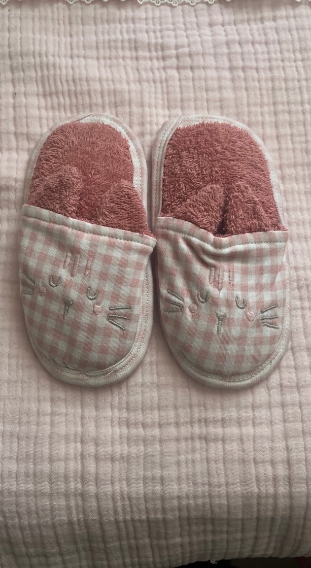 Kız çocukları için yumuşak kürklü iç kısmı ve nakışlı pastel pembe kareli örme dış kısmı olan banyo sonrası terlikleri. İç mekan kullanımı için uygundur.
