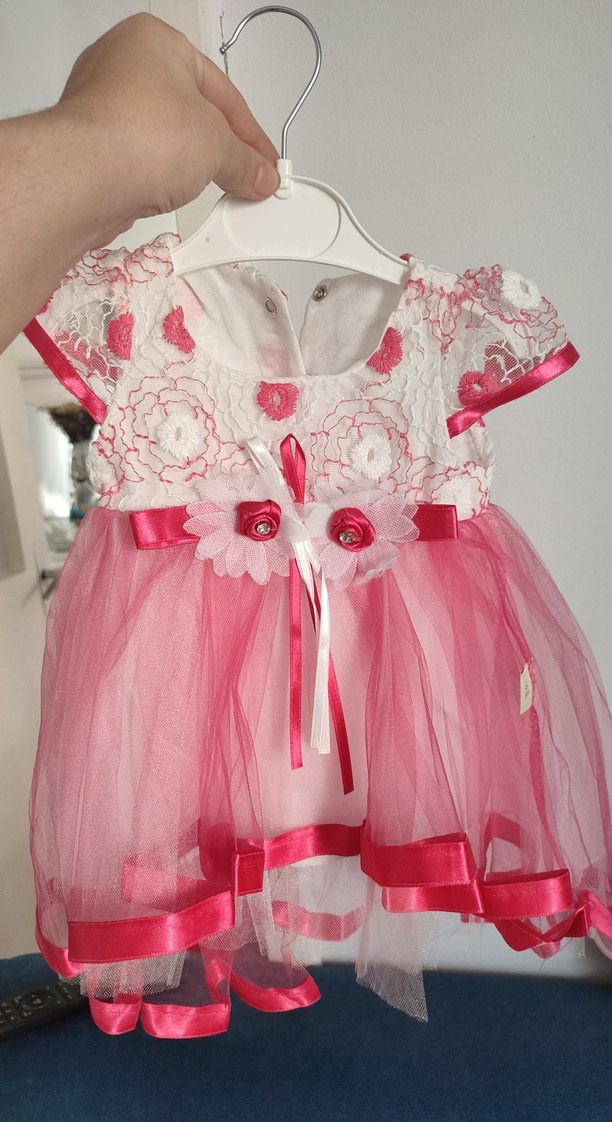Renkli nakışlı dantel detaylarıyla pembe kız çocuk elbise, straplez yakalı ve vücuda oturan kesime sahip, yumuşak sentetik kumaştan üretilmiştir.