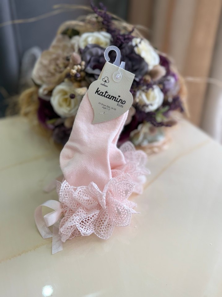 Pastel pembe renkte, nakış detaylı ve dantelli kenarlı kız çocuk çorabı. Üzerinde 'katamino' markası bulunur.