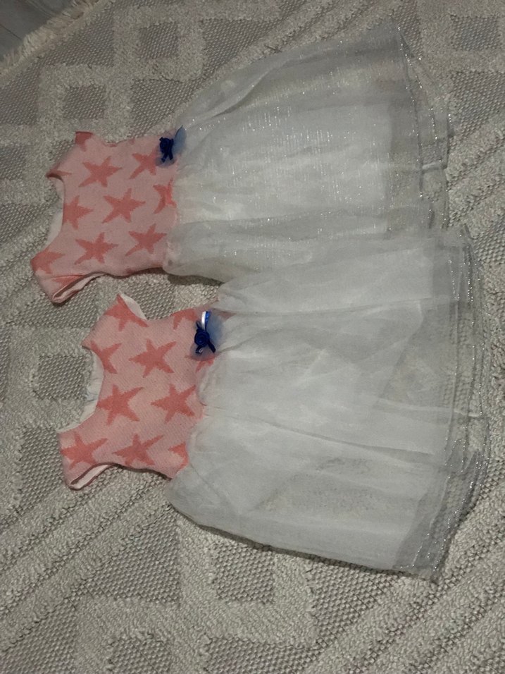 Kolsuz, straplez pembe üst kısmı nakışlı yıldız desenli, beyaz dantelli etekli kız çocuk elbisesi, pastel sokak modası tarzında.