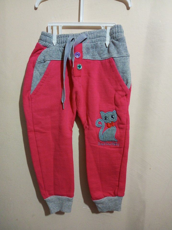 Pembe, bol kesim, düğmeli ve nakışlı kedi desenli kız çocuk eşofman altı. Yumuşak ve sıcak kumaştan, gri detaylı ve cepli.