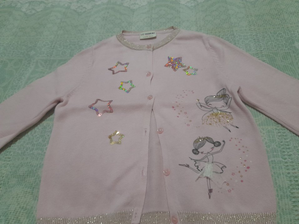 Kız çocuklar için pembe, uzun kollu, düğmeli ve nakışlı figürlerle süslenmiş, vücuda oturan triko hırka. ✨