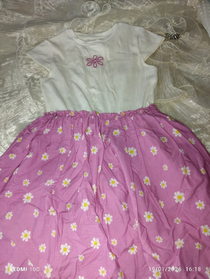 Kız çocuk elbisesi, beyaz kısa kollu üst ve pembe, beyaz çiçek nakışlı bol etek ile bohem tarzda tasarlanmıştır.