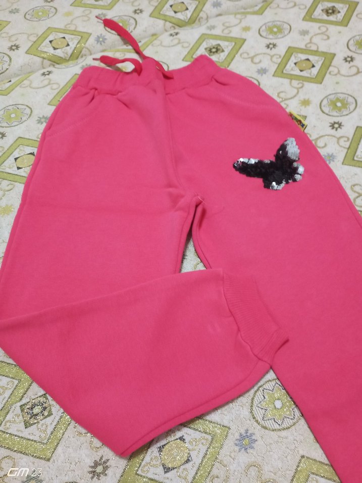 Yumuşak kumaştan, bol kesim pembe kız çocuk eşofman altı. Renkli nakışlı ve payetli kelebek detayıyla trend görünüm.