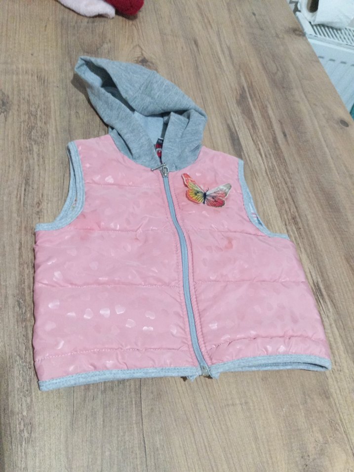 Kız çocukları için pembe, nakışlı kelebek detaylı, kapüşonlu ve fermuarlı yelek. Kolsuz, straplez yakalı ve sıcak tutan kumaştan üretilmiştir. Trend sokak stili için uygun.