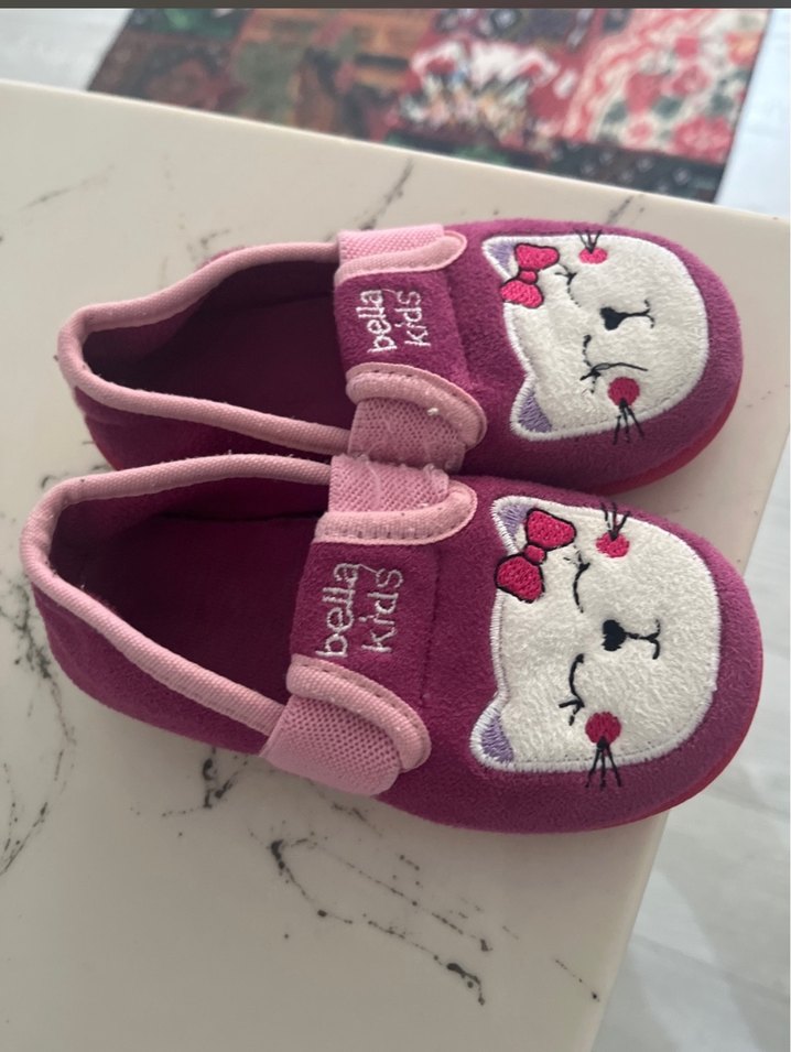 Kız çocukları için yumuşak ve sıcak kumaştan yapılmış, renkli nakışlı kedi yüzlü terlikler. Kolay giyim için cırt cırtlı bantlıdır.