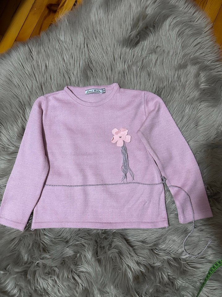 Kız çocukları için uzun kollu, yuvarlak yakalı, yumuşak dokulu pembe triko kazak. Nakışlı çiçek detayı ve bol kesimiyle sade ve rahat bir model. Pembe kemer detaylı kazak boyu 40 41 cm eni 39 cm, kolu 39 cmdir.
