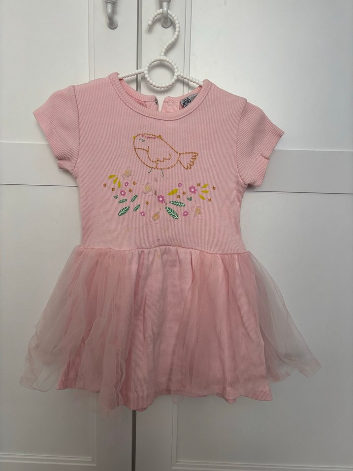 Kısa kollu, bisiklet yaka ve nakış detaylı, fit kesim kız çocuk elbisesi. Pastel pembe renkte, yumuşak sentetik kumaştan fırfırlı etekli.