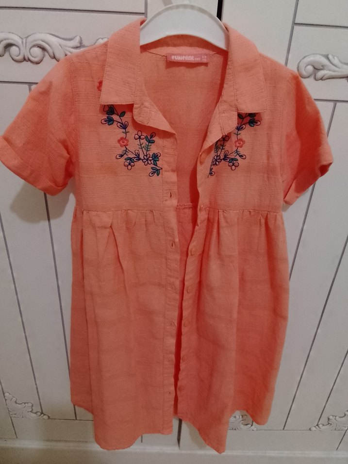 Pembe renkli, kısa kollu, düğmeli ve nakış işlemeli kız çocuk elbisesi. Gevşek kesim, straplez yaka ve yumuşak dokulu kumaştan bohem tarzda.
