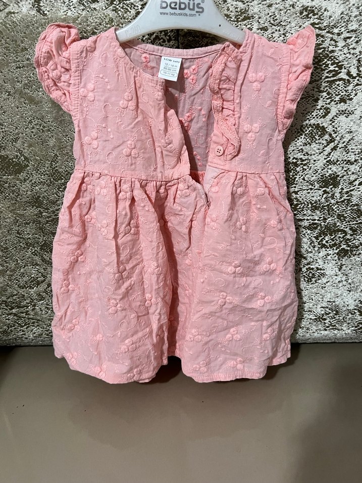 Pastel pembe renkli, nakışlı ve kolsuz kız çocuk elbisesi. Keten kumaştan, bol kesim ve V yaka, fırfırlı kollu bohem tarzda.