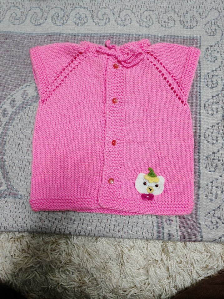 Fitted kesim, pembe renkli, kolsuz, nakışlı kız çocuk triko süveter, düğmeli ve yumuşak örgü kumaştan yapılmıştır.