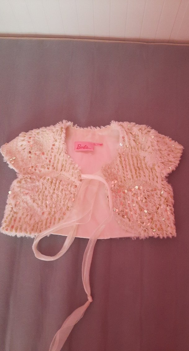 Kız çocuklar için pembe, nakışlı ve fırfırlı detaylara sahip, örgü kumaştan yapılmış, kolsuz ve vücuda oturan bolero.
