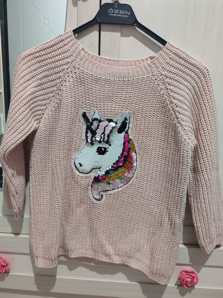 Pembe renkli, uzun kollu, yuvarlak yakalı kız çocuk örgü kazak. Nakışlı unicorn deseniyle trend sokak stili sunar. Çift taraflı pullu. Yurtdışından alındı. Sayılı giyildi