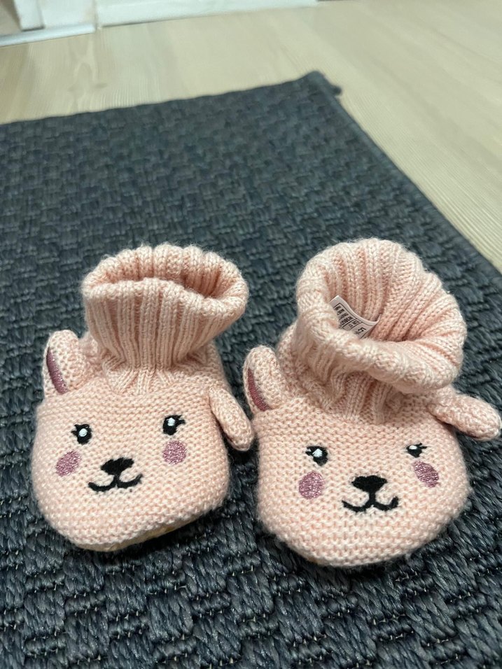 Kız çocuklar için pembe örgü panduflar, nakışlı hayvan yüzleri ve yumuşak, sıcak dokusuyla rahat kullanım sağlar.