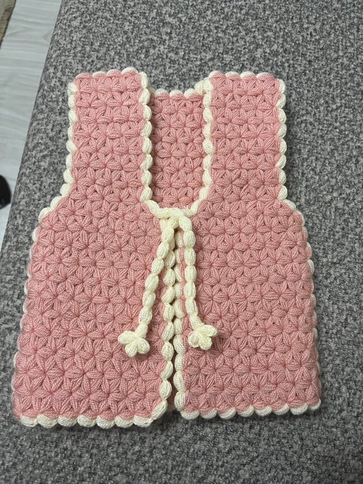 Fıstıklı örgü desene sahip, krem bağcıklı, bisiklet yaka ve kolsuz, pembe kız çocuk yeleği. Kendi el emeğimdir. Ürün elimde hazır bulunmaktadır. Direkt kargo yapılacaktır.