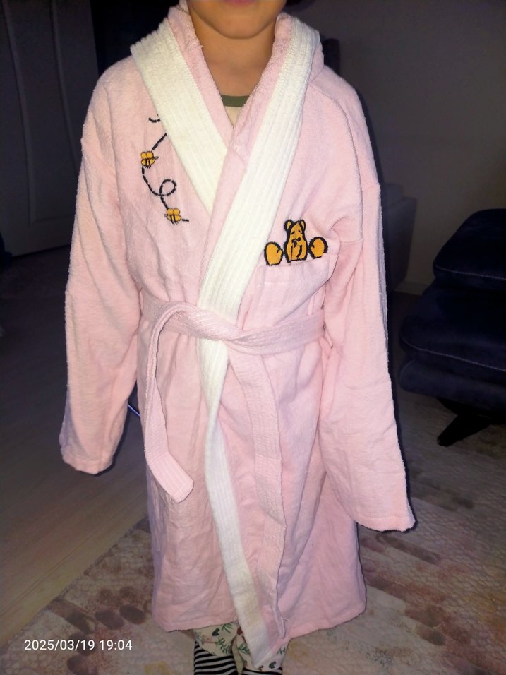 Yumuşak beyaz yakalı, nakış detaylı ve kuşaklı pembe kız çocuk bornozu. %100 pamuk