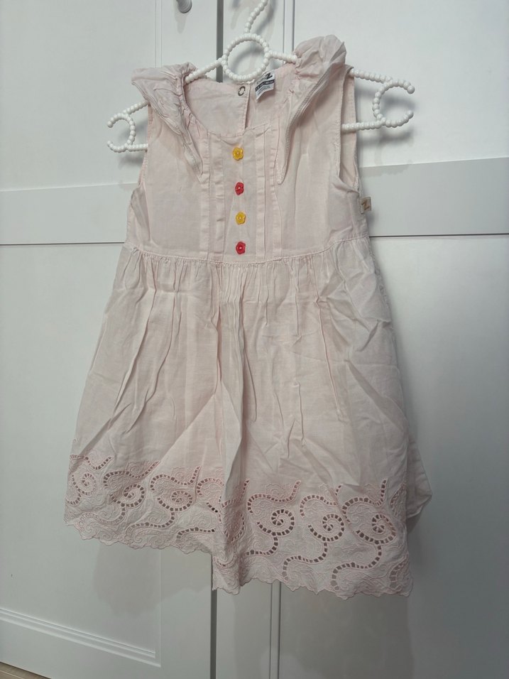 Pembe pamuklu, kolsuz ve bol kesim elbise. Nakış detayları ve renkli düğmelerle bohem tarzda. Straplez yaka ile tamamlanmıştır.