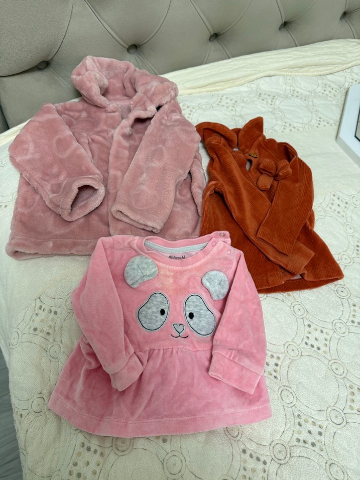 Pastel pembe renkte, uzun kollu ve bol kesim kız çocuk sweatshirtü, yumuşak ve sıcak kumaştan, nakışlı panda detaylarıyla. Pembe olan düğmeli ve mont diye geçiyo kahverengide hırka pembe olan swet