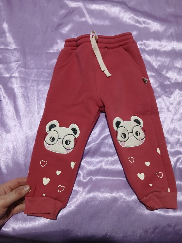 Yumuşak kumaştan, nakışlı panda yüzleri ve kalp desenli, düğmeli detaylı pembe rahat kesim kız çocuk eşofmanı.Kızım için aldım ama ameliyat olduğu için hiç kullanamadı yeni sahibine hayırlı olsun #kızçocuk #eşofman #lcwaıkıkı #defacto #zara #helleobaby