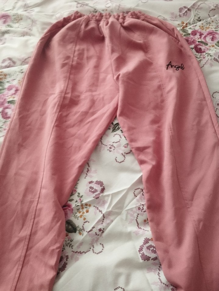 Yumuşak sentetik kumaştan yapılmış, nakış detaylı ve düğmeli, rahat kesim pembe kız çocuk eşofman altı. görselini attım ütünün hafif izi var