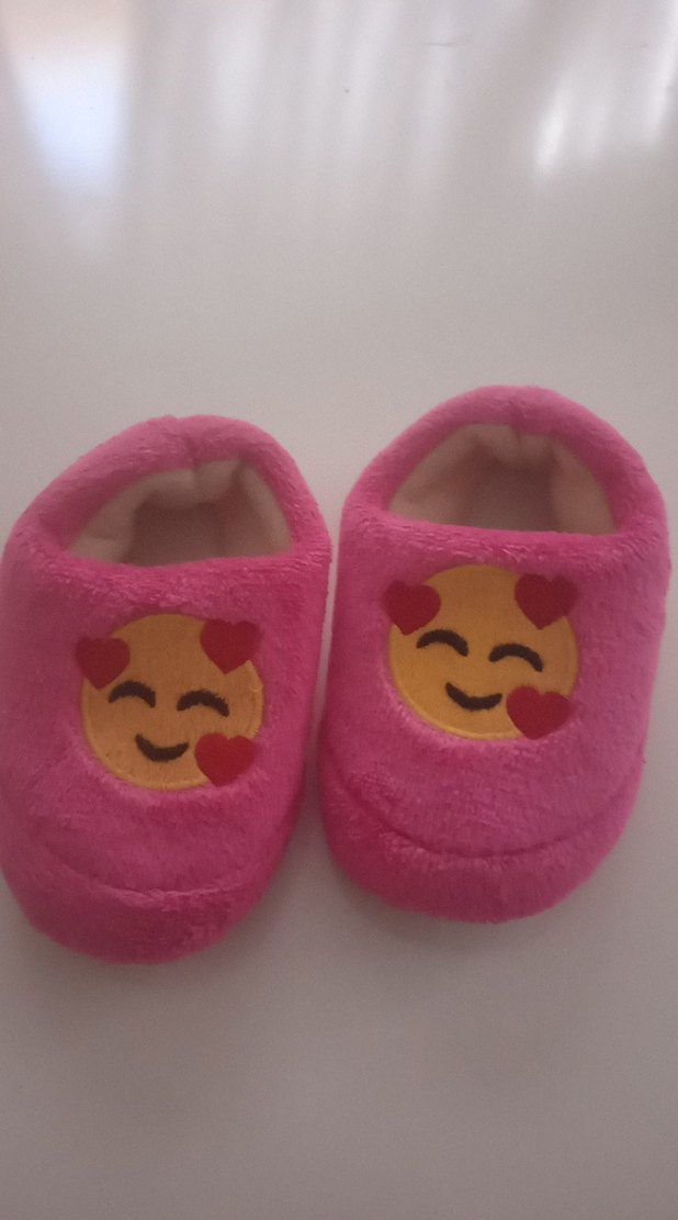 Yumuşak polar kumaştan, nakışlı gülen yüz desenli ve örme detaylı pembe kız çocuk sıcak ev terliği.