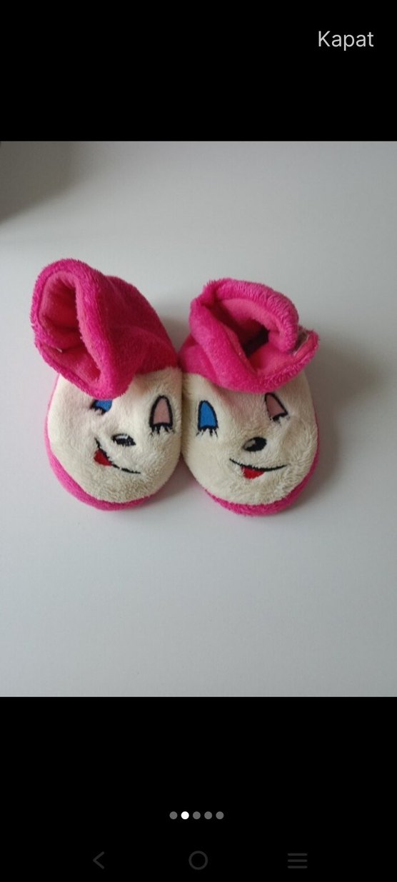 Nakışlı gülen yüz detaylı, pembe renkli, sıcak ve yumuşak kumaştan kız çocuk ev terliği. Renkli ve pop kültür tarzında.