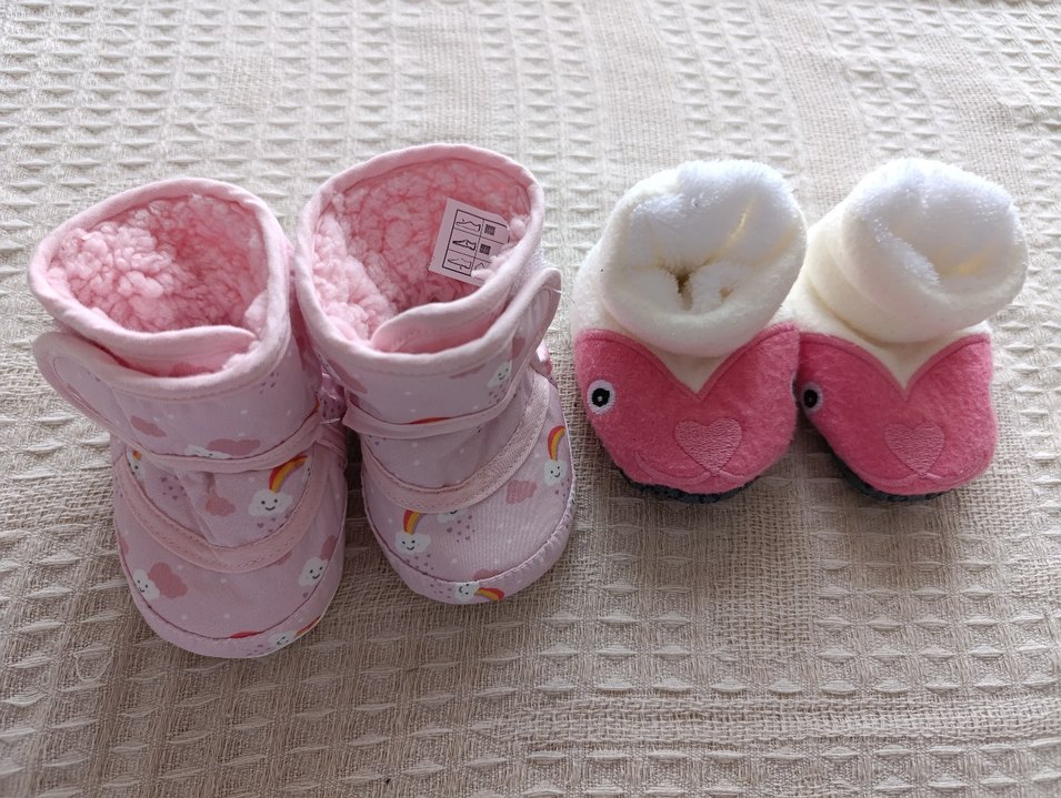 Renkli pembe nakışlı kız çocuk terlikleri, örgü detaylı ve yumuşak kürklü iç yüzeyi ile sıcak tutar. hiç kullanılmadı biri cıvıl biri ebebek
