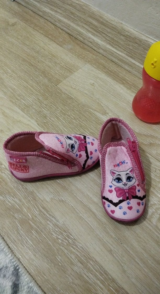 Pembe renkli, nakışlı kedi desenli ve cırt cırtlı kız çocuk terliği. Kauçuk tabanlı, sıcak tutar. Marka: gEZER.