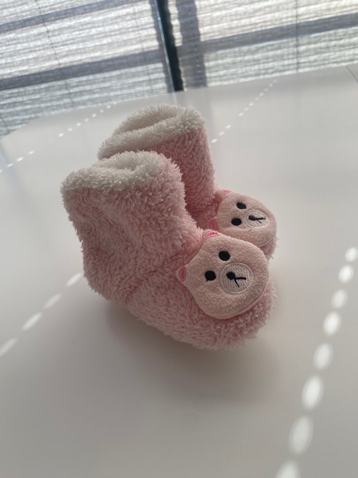Kız çocukları için pembe, yumuşak örgü tüylü kumaştan yapılmış, renkli nakışlı ayıcık yüzü detaylı sıcak ev terliği. 18.19 ayağı olan bebekler uygundur