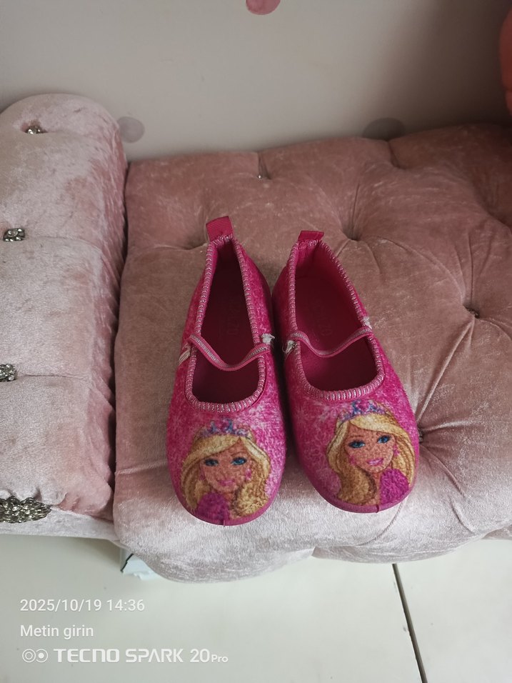 Renkli nakışlı, yumuşak kürklü ve cırt cırtlı kız çocuk pembe terlik.