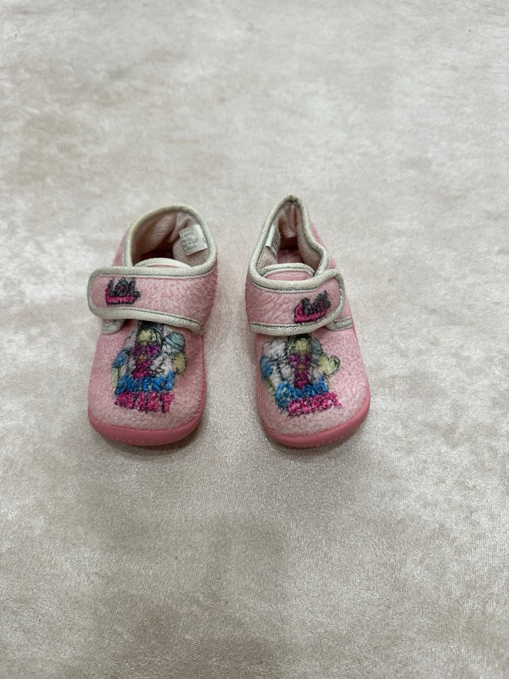 Nakışlı renkli desenlere ve cırt cırt bantlara sahip, yumuşak kumaştan yapılmış pembe kız çocuk sıcak terlikleri. (5.ç) #bebek #giyim #kıyafet