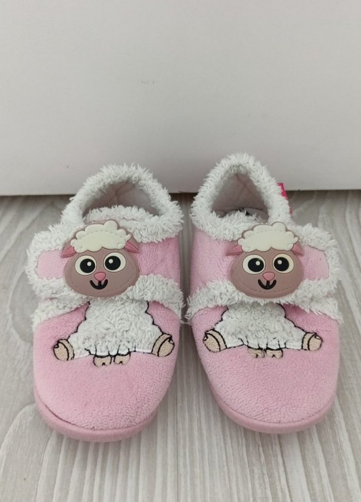 Pembe renkte, yumuşak ve sıcak kumaştan, nakışlı kuzu desenli kız çocuk terlikleri. Triko detaylı ve pastel tonlarda, rahat kullanım sağlar.