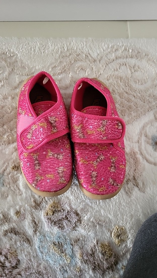 Renkli pembe nakışlı desenlere sahip kız çocukları için sıcak terlik, kolay giyim için Velcro bantlıdır. Kauçuk taban dayanıklılık sağlar.