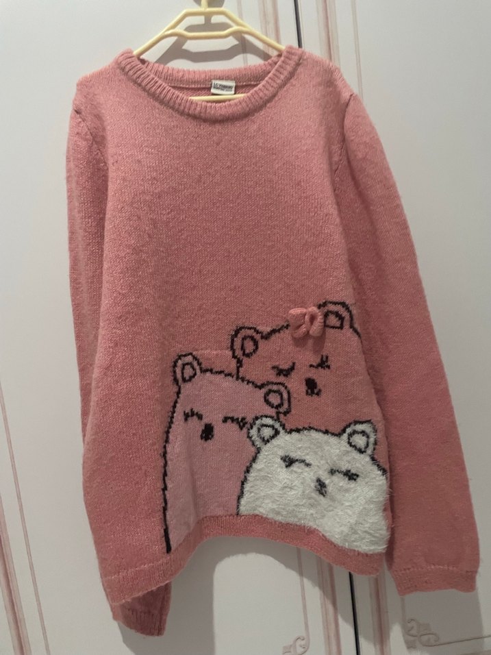 Uzun kollu, yuvarlak yakalı, nakışlı ayıcık desenli, pembe renkli, rahat kesim kız çocuk triko kazak. Pastel tonlarda, yumuşak dokulu.