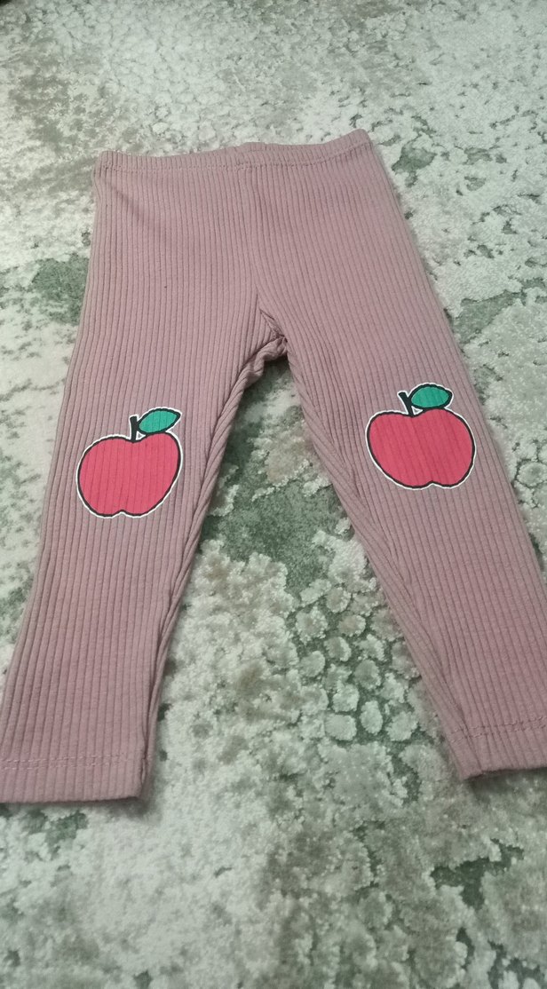 Kız çocukları için pembe renkli, triko dokulu ve diz kısımlarında nakışlı elma desenleri bulunan dar kesim tayt.
