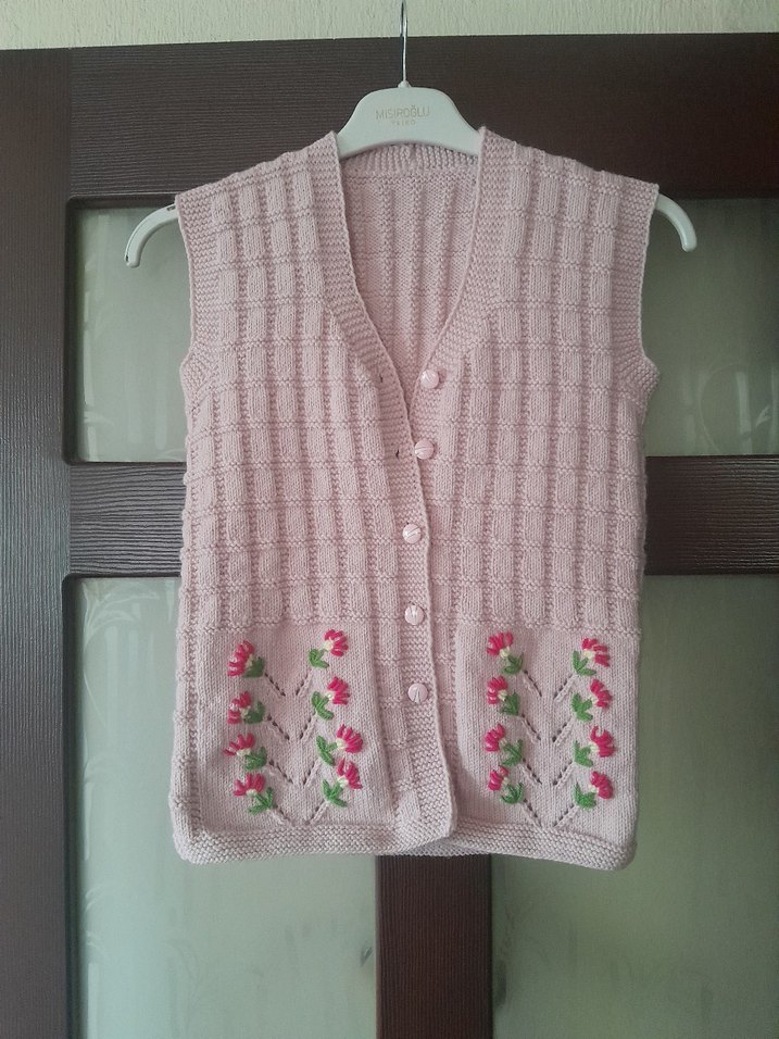 Pembe renkli, V yakalı, nakışlı ön cepli, düğmeli, regular fit kız çocuk triko süveter. iki koltuk arası 38cm boy uzunu 55cm yeni el örgüsü