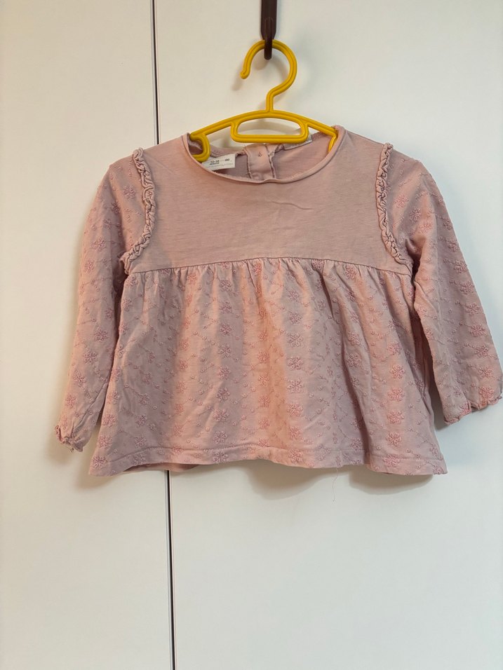 Pastel pembe kız çocuk bluz, uzun kollu, yuvarlak yakalı ve bol kesimdir. Yumuşak keten kumaştan, nakışlı desenli ve kollarında fırfır detaylıdır.
